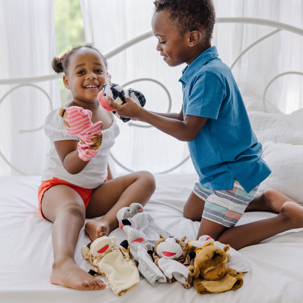 Two four-piece hand-puppet sets featuring friendly animals make it easy for children and caregivers to role-play together! Each set includes four simple glove puppets in coordinated themes (Farm Friends and Zoo Friends). Hand puppets are great for developing motor skills, hand-eye coordination, communication skills, self-confidence, parent-child bonding, and so much more! Made with brightly patterned, washable fabrics and built to last, these soft and sweet hand puppets are sure to be go-to toys for years to come. Farm Friends includes a sheep, cow, pig, and horse; Zoo Friends includes a tiger, monkey, elephant, and giraffe.