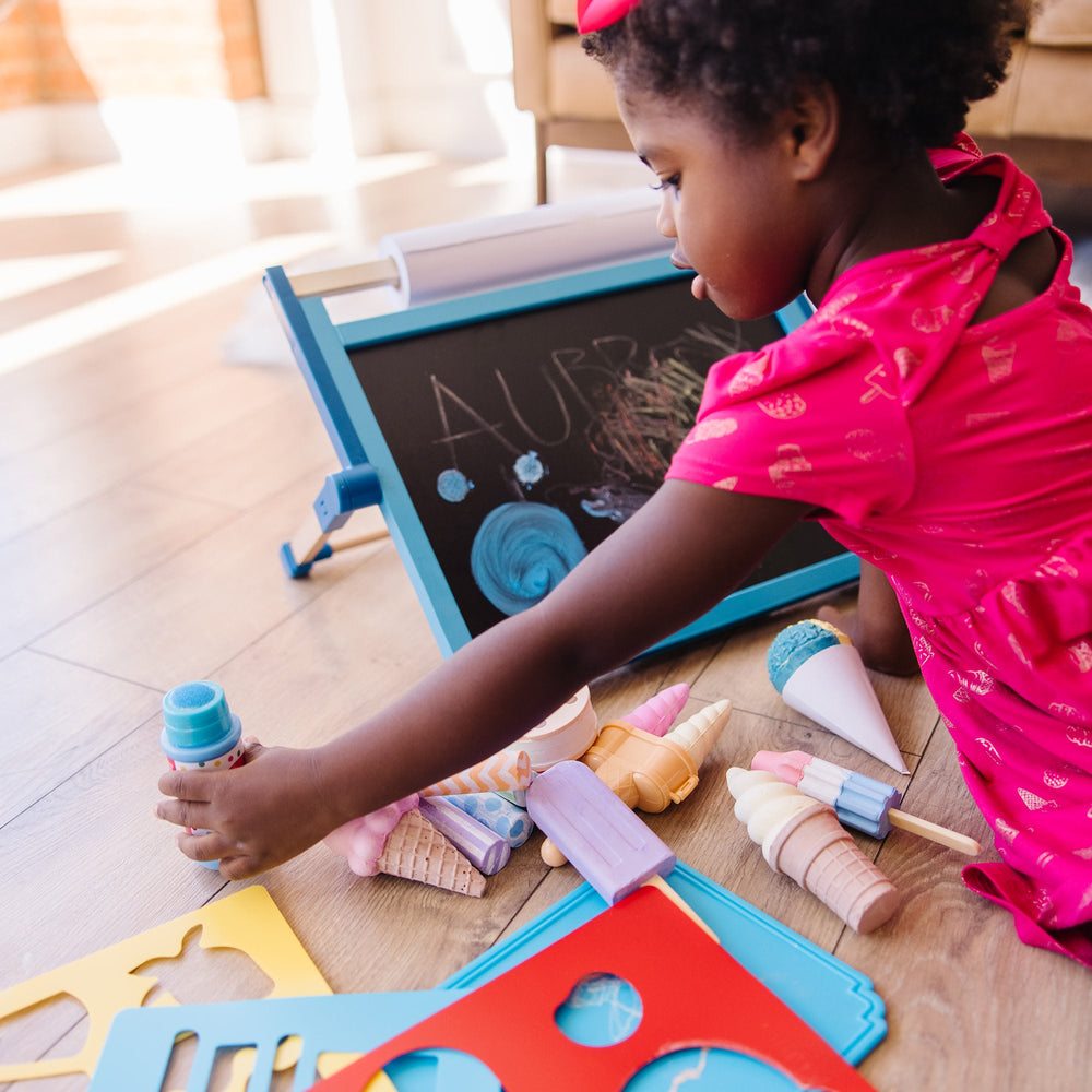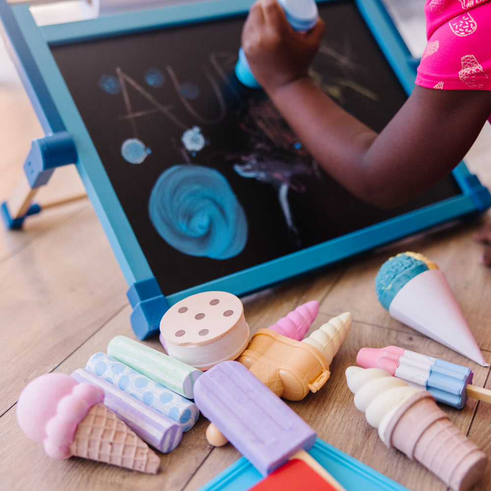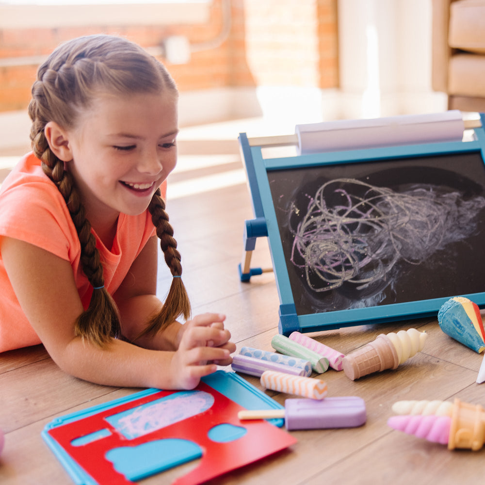 Chill out and create countless scenes with colorful chalk in “cool” ice cream shapes! Draw, trace, and stamp chalk designs with chalk ice cream cones, soft serve swirls, ice pops, jumbo sticks, and more! The vibrant colors in this 33-piece play set are perfect for drawing on the included sign with holder, sidewalks, driveways, or chalkboards. Trace shapes on three extra-thick stencil sheets or make quick and easy double lines with a “soft serve cone” chalk holder! Add water to the sprinkle stamper to make chalk paint polka-dots. There are drawing and game ideas to help jumpstart imaginations—the possibilities are endless! Kids three and older will love creating cool chalk designs again and again!