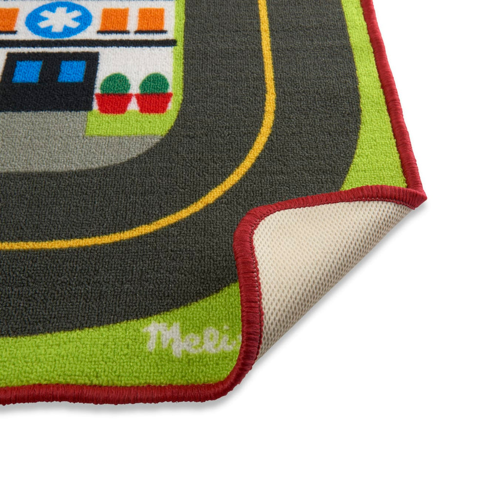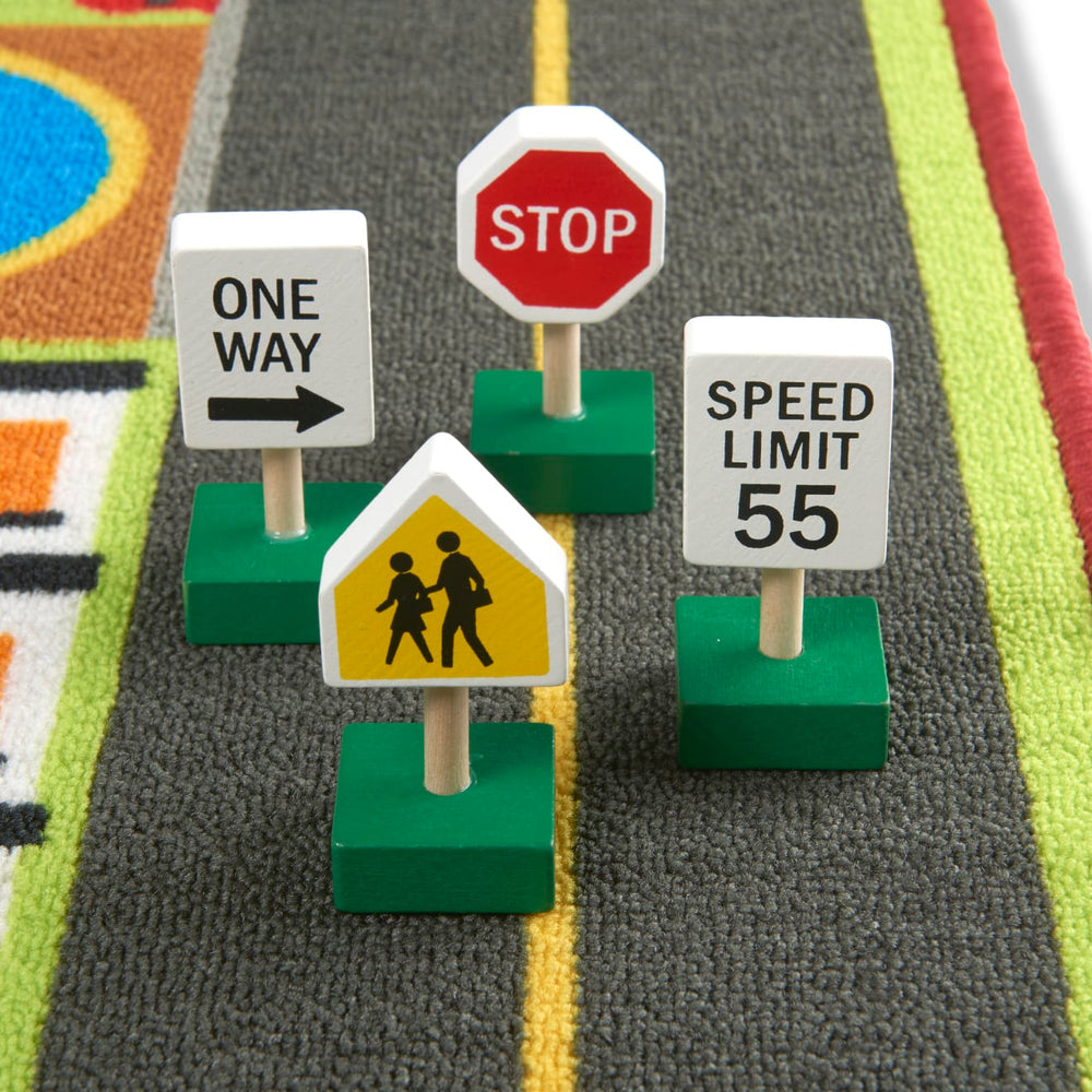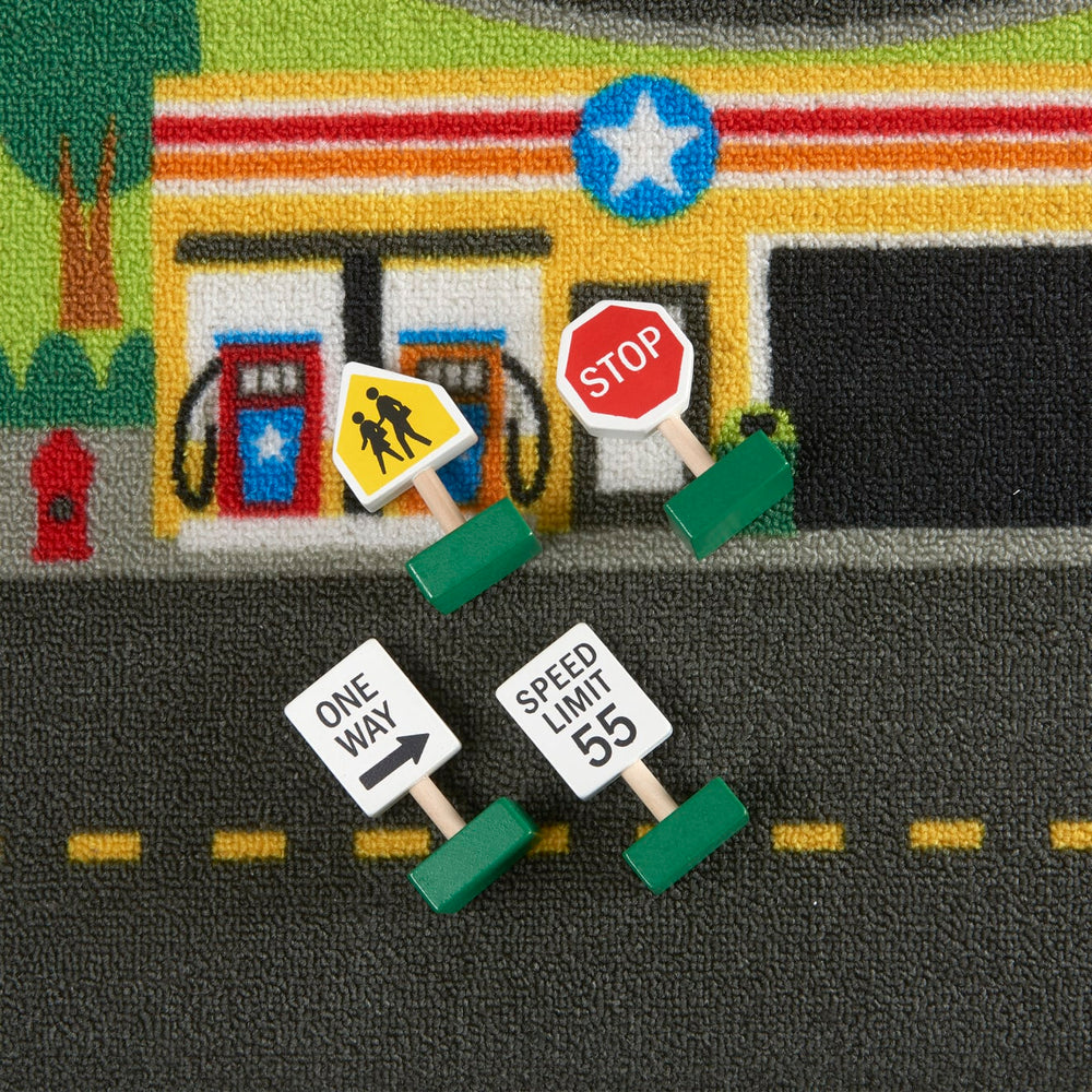 Kids will have jumbo amounts of fun as they race to the rescue, around the track, and all over town on the Jumbo Roadway Rug! Roads wind through town, past a construction site, a hospital, a farm, a speedway, and more, for countless imaginative adventures on the 32 square feet of play space. Made from durable material that is incredibly soft to the touch for extra comfortable play, this multi-activity rug features a skid-proof backing and reinforced border binding. Four wooden traffic signs are included to help kids three and older direct traffic!