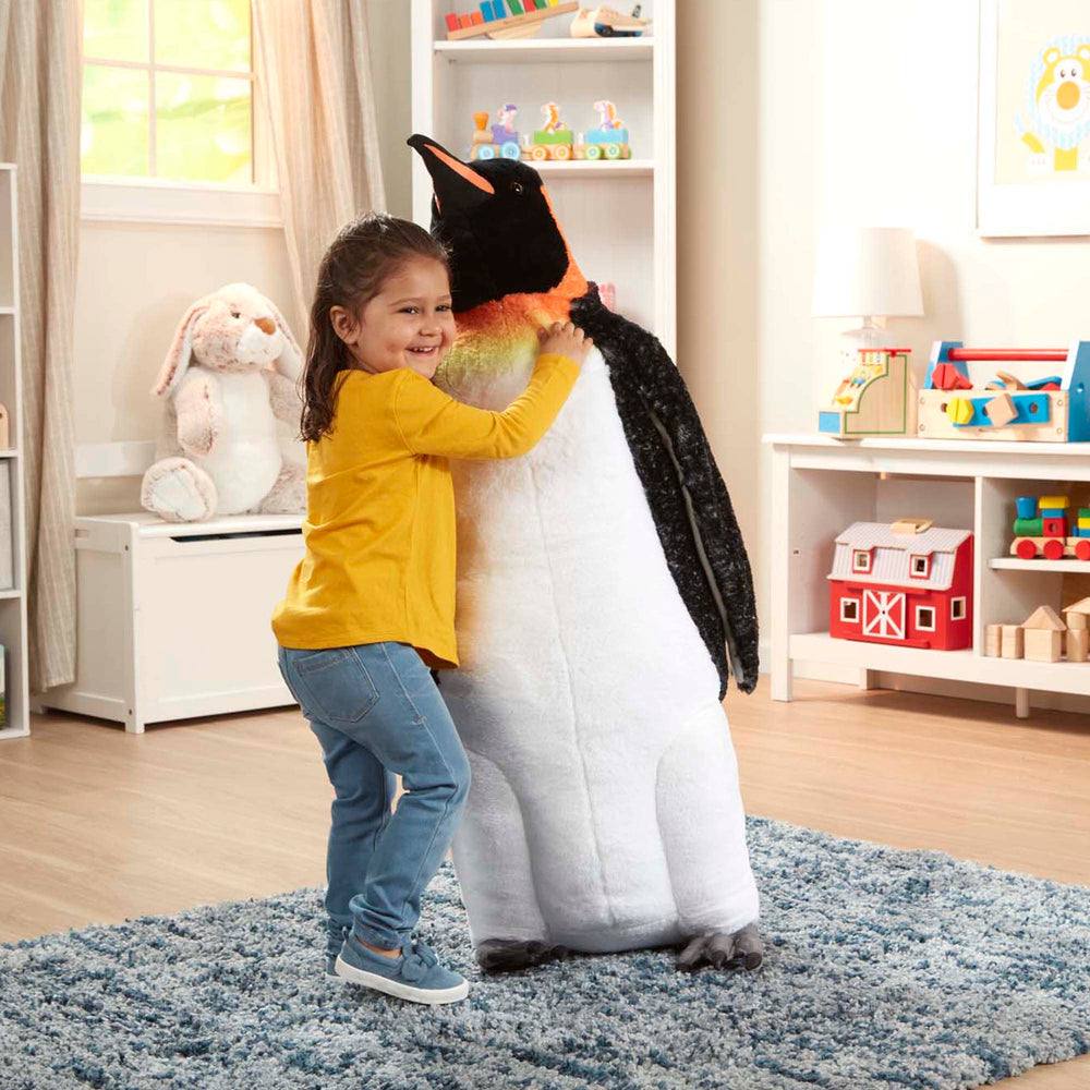 This gentle giant of a seabird is sure to waddle its way into the heart of any animal lover! Standing more than three feet tall (just like real full-grown emperor penguins), this regal bird’s super-silky-soft fur encourages hugs and cuddles, while quality construction and a strong interior structure keep it standing proudly for years to come. Sure to be the focal point of any room or play space, the penguin features realistic details like soft clawed feet that keep it standing upright,, a long beak stretching upward, and beautiful black, white, orange, and yellow coloring. This bird may never fly, but kids’ imaginations will certainly take flight with this adorable companion by their side!