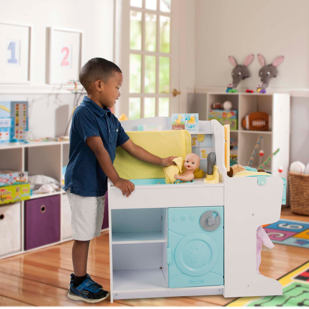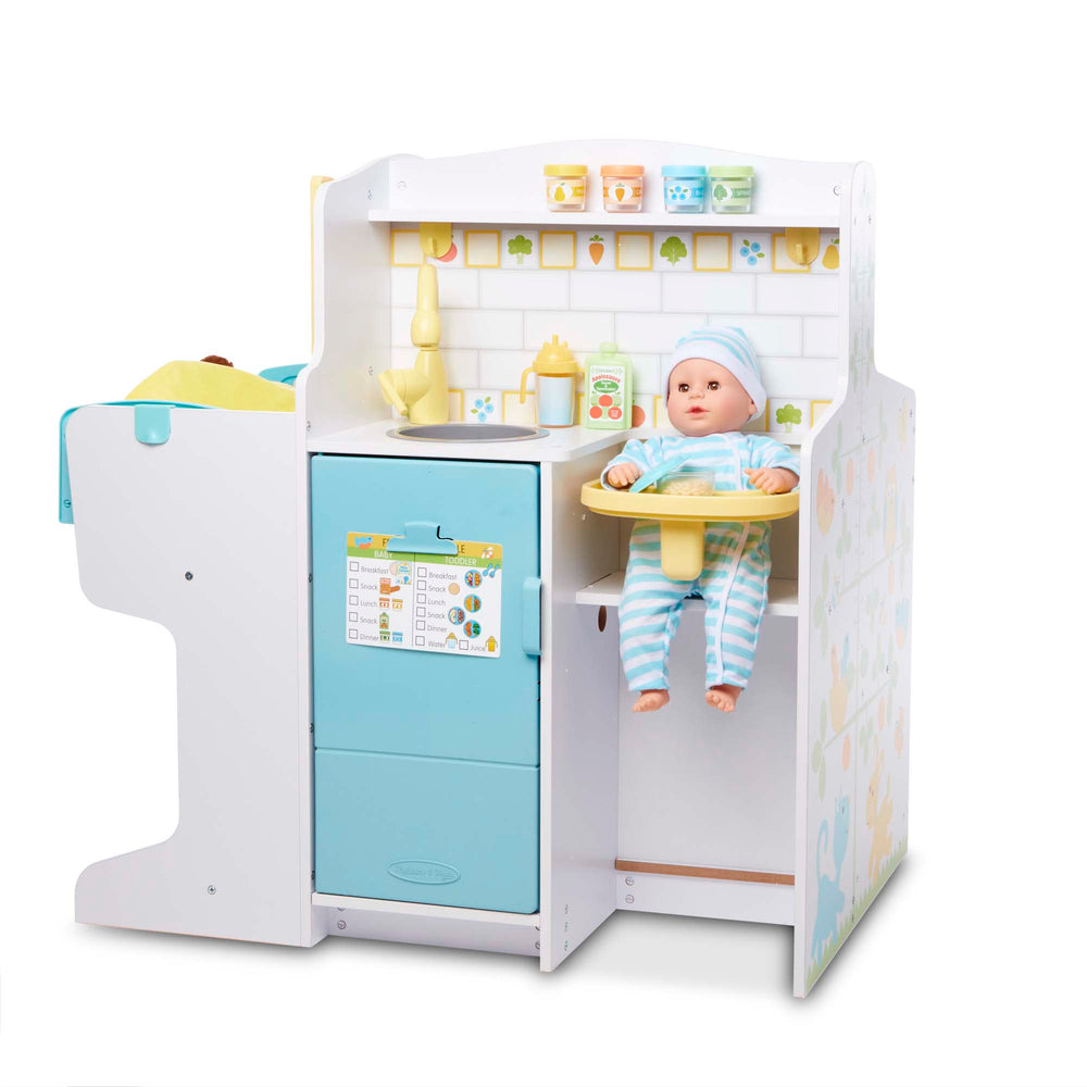 This multi-functional doll and stuffed animal baby care activity center has everything kids need to nurture and play with their special babies! The sturdy wooden center includes a kitchen with refrigerator, sink, and high chair. A changing and bathing area features a bathtub with spray nozzle and flip-down changing mat, a mirror, wipes dispenser, diaper disposal, and washing machine with clicking dial. The nursery area has a rocking cradle, clothing storage, and shuttered window with a card that can be flipped to a daytime or nighttime scene. Fits dolls and stuffed animals approximately 15 inches to 18 inches tall. Detailed assembly instructions are included. Kids three and older will love having their very own space to nurture and care for their babies!