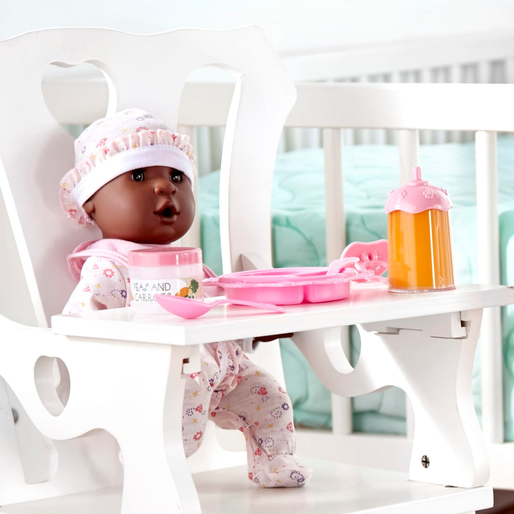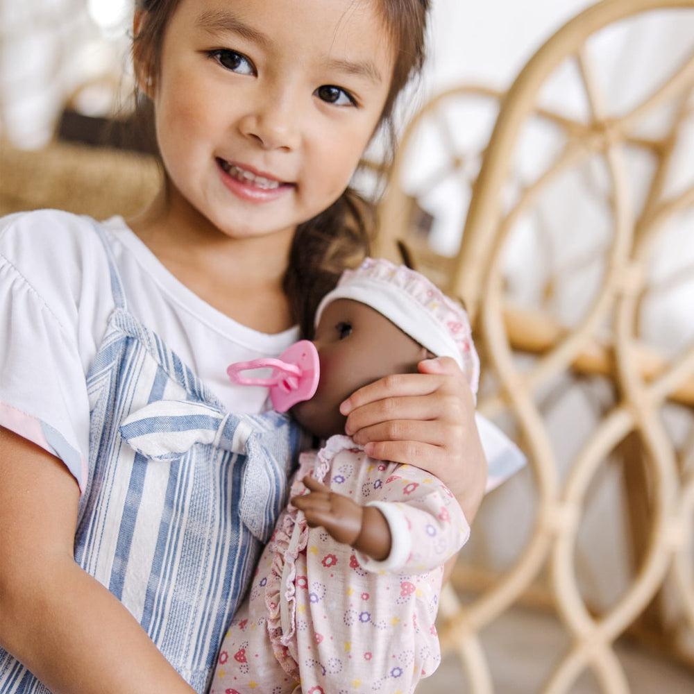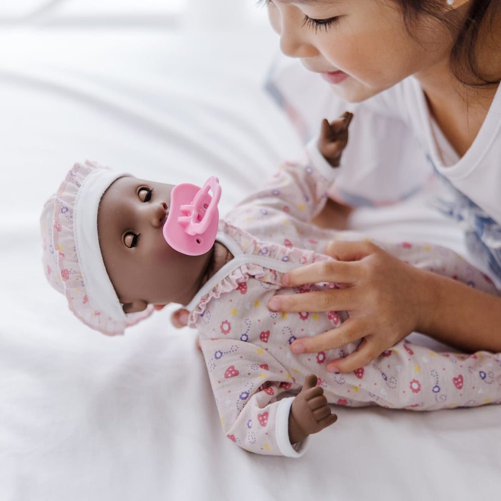 This adorable baby doll is just the right size to hug and cuddle. Gabrielle has molded plastic hair and her beautiful brown eyes open and close! She loves to be held and can also sit up "like a big girl." Her pretty frilled clothing features hearts and flowers and is removable for dressing and undressing fun, and she can suck her thumb or the included pink pacifier. Doll is 12" tall.