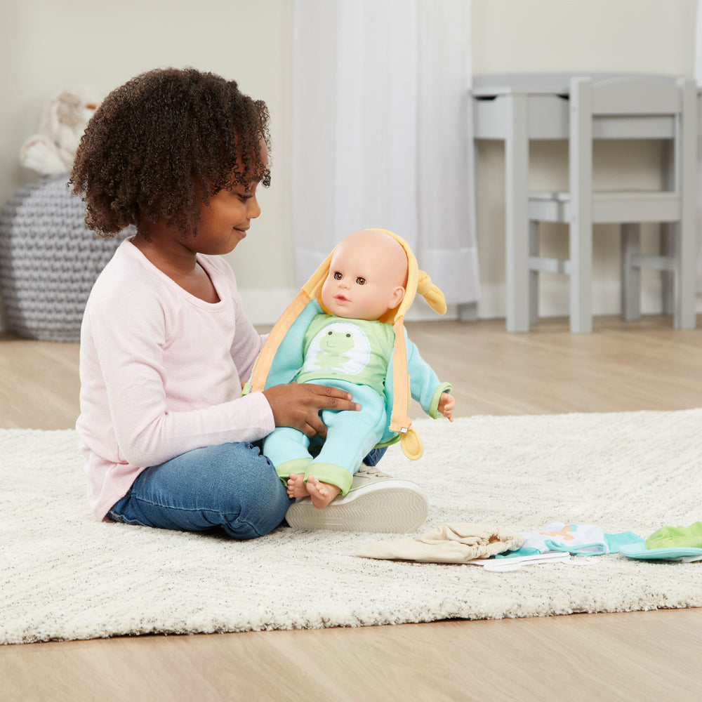 Dress up dolls for playtime with this six-piece set of coordinating unisex clothes, sized to fit 12-inch to 18-inch dolls! Mix and match the long-sleeved froggy character shirt, puppy dog T-shirt, soft pants with elastic waistband, hooded zip-front sweatshirt, easy-on cargo shorts, and adjustable-band cap! Sturdy construction and quality fabric mean dolls will be dressed to play for years to come. All pieces are machine washable and hang on two durable hangers. With Mine to Love accessories, kids three and older can explore grown-up roles and responsibilities while having endless fun caring for their babies. (Dolls/stuffed animals not included with this set.)