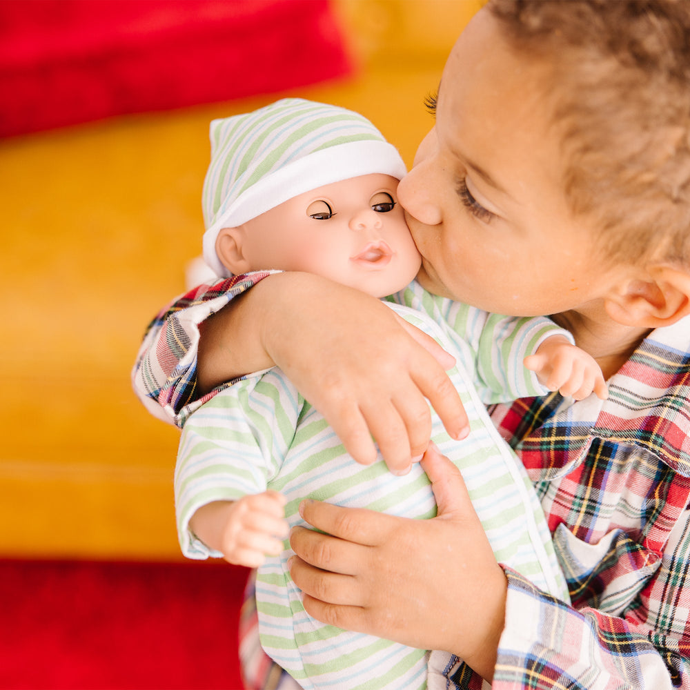 It’s twice the fun with twin 15-inch dolls Sebastian and Sofia! They have adorable coordinating removable rompers and caps, eyes that open and close, and they can suck their thumbs or the included pacifiers. Just right for kids 18 months and older, their soft, huggable bodies are lightly scented, with wipe-clean, medium skin-tone faces and limbs. Mine to Love dolls and accessories encourage empathy and help kids express themselves as they explore grown-up roles and responsibilities. A child’s confidence and self-esteem blossom and grow with each nurturing moment of imaginative play. Sebastian and Sofia are just waiting for a child to call them “Mine to Love”!