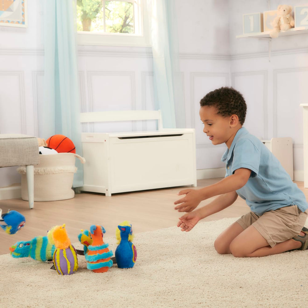 It's scary how much fun you'll have with these fuzzy monster pals! The beastly bowling set adds color, texture, and a whole lot of eyes to a familiar game. Six wacky plush pins with goofy expressions have weighted bottoms for extra stability, touchable textures, and detailed stitching. Set up the pins in different formations, then use Klonk, the silly stuffed ball, to knock them down! The set stores in a handy mesh bag to take the bowling fun wherever kids go.